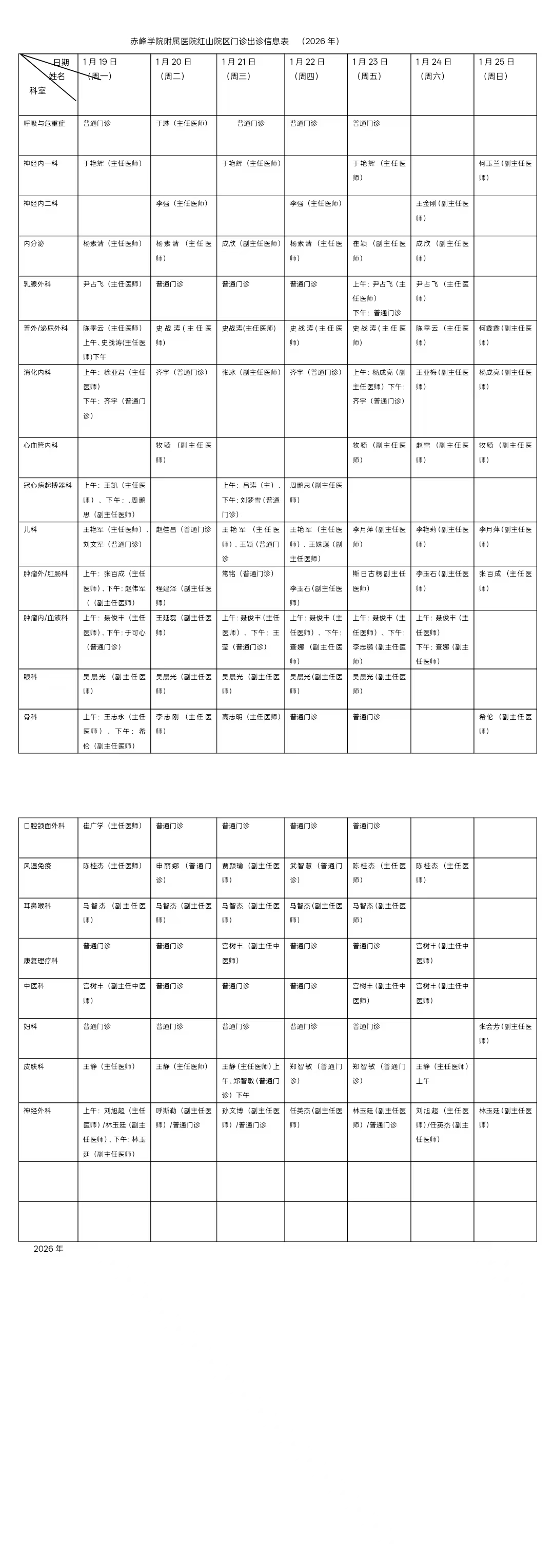 赤峰学院附属医院红山院区门诊出诊信息(2026/01/19-2026/01/25)