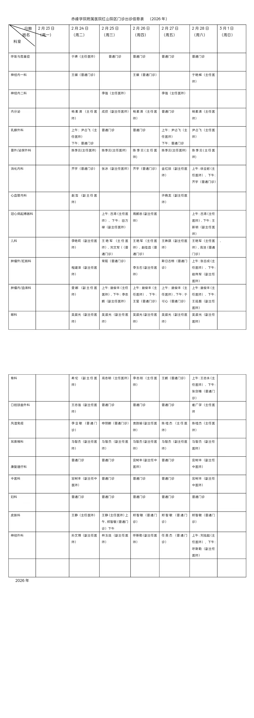 赤峰学院附属医院红山院区门诊出诊信息(2026/02/23-2026/03/01)